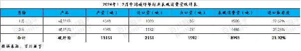 綜合來看,2024年(nian)1-2月(yue)國內碳纖維市場價格區間窄幅波動,但(dan)下游(you)需求偏淡,碳纖維產(chan)品進口(kou)貨源(yuan)同(tong)比減少,且主要以進口(kou)碳纖維為(wei)主,其他產(chan)品進口(kou)相對較少。