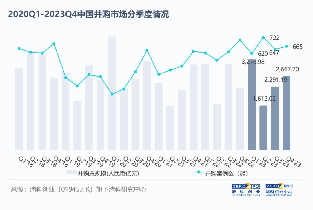 根據清科研究(jiu)中(zhong)心統(tong)計,2023年度中企參與的并購交易活躍度穩步提升,并購案例數總量2,654起,同比增長4.7%;涉及交易總金額近萬億,受上年大額案例波動影響同比略有下滑。從并購特點來看,以國央企資產優化整合、傳統產業轉型升級及中企國際化發展等為目的的并購交易是市場主要構成。季度趨勢方面,從歷史數據來看,中企參與并購交易呈現了較為明顯的周期性特征,2023也年延續了該趨勢。受春節假期影響,2023年第一季度交易活躍度略有下滑,但到下半年交易總量與活躍度都持續穩步回升,其中第四季度中企參與的并購交易總量達665起,交易總規模達到2,667.70億元人民幣,分別環比增長2.8%、16.4%。