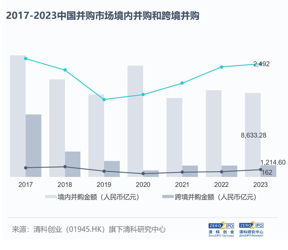 2023年(nian)國內經(jing)濟持續恢復(fu),同(tong)(tong)時A股并(bing)購重組政策迎來(lai)窗(chuang)口期,2023年(nian)中企(qi)參與的(de)(de)國內并(bing)購交易總(zong)(zong)量(liang)(liang)達到2,492起(qi),同(tong)(tong)比增長2.9%;但(dan)受(shou)小額(e)案例(li)增多影響交易總(zong)(zong)金(jin)額(e)相(xiang)比2022年(nian)度下降3.4%,達到8,633.28億元人民(min)幣,交易數量(liang)(liang)及規模分別達到市場總(zong)(zong)量(liang)(liang)的(de)(de)93.9%、87.7%。