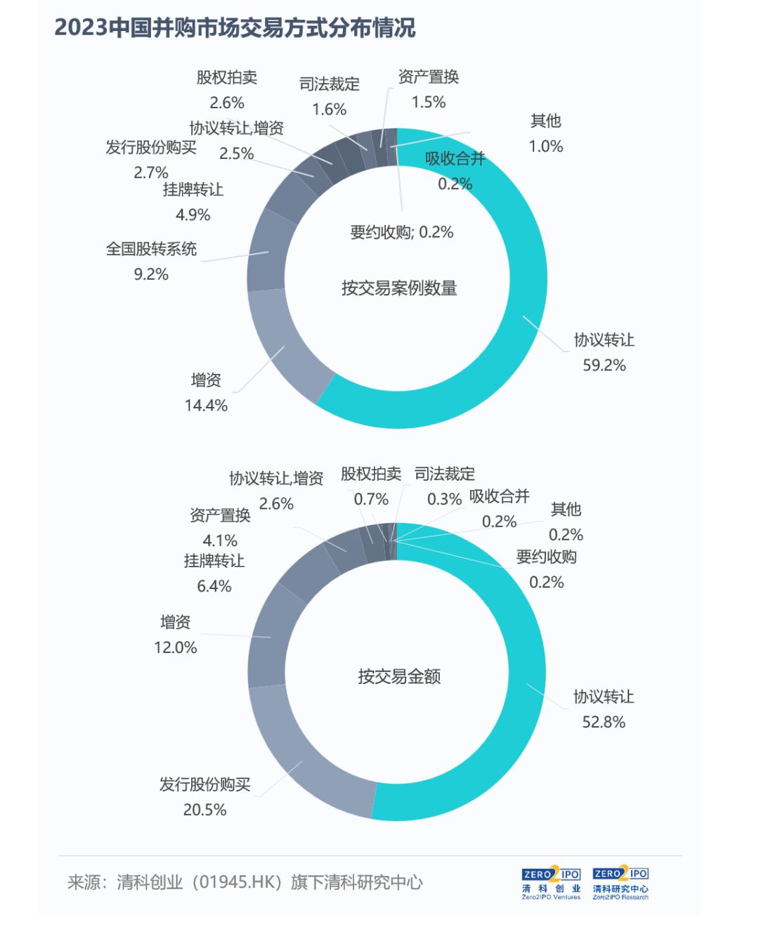 從交易數(shu)量來(lai)看,2023年中企并購案例主要通過協議轉讓、增資、股轉系統轉讓三大交易方式進行,合計案例數量占比超八成。分市場來看,境內市場并購交易主要采用協議轉讓、增資、全國股轉系統轉讓、發行股份購買等方式;而跨境并購約九成采用協議轉讓方式。此外,與2022年相比,2023年通過司法裁定及股權拍賣方式交易的并購案例達到112起,同比增長21.4%。