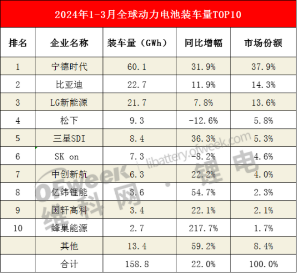 從1-3月的國內六家企業來看,寧德時代同比增長31.9%(60.1 GWh),繼續穩居全球第一。除了極氪和理想汽車等主要品牌車輛外,寧德時代還向Model 3/Y、寶馬iX、奔馳(chi)EQ系(xi)列(lie)、大眾ID系(xi)列(lie)等(deng)全(quan)球主要主機(ji)廠提(ti)供(gong)電池,是唯(wei)一一家超過30%市(shi)場(chang)份額(e)的(de)供(gong)應商。