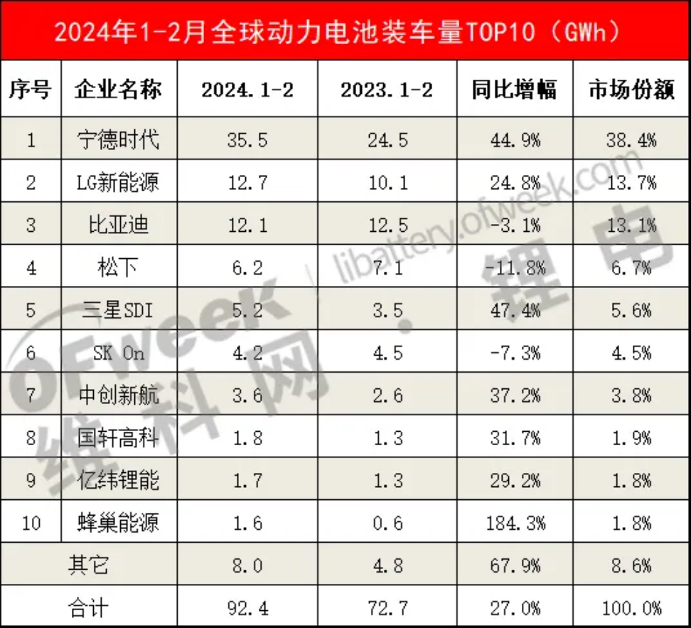 1-2月全(quan)球電動(dong)汽車動(dong)力電池裝(zhuang)車量(liang)TOP10,分別是:寧德時(shi)代、LG新能(neng)(neng)源、比亞迪、松下、三(san)星SDI、SK On、中創(chuang)新航、國(guo)軒高科、億緯鋰能(neng)(neng)、蜂(feng)巢能(neng)(neng)源。