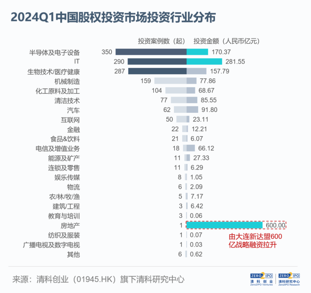 其中,半導體及電子(zi)設備行業以350起(同比-34.9%)案例數居于榜首,功率半導體、光電半導體、智能傳感器等賽道熱度延續,但大額投資案例有所縮減,僅2起事件投資規模在10億元及以上。其次為IT行業,共發生投資案例數290起(-31.8%),伴隨AI技術和新模式、新形態、新應用加速涌現,人工智能領域投融資活躍,國內知名AI大模型企業月之暗面、Minimax均在本季度獲得數十億元資金注入,推動投資金額同比增加117.3%。生物技術/醫療健康行業以287起(-37.7%)案例緊隨其后,創新藥、醫療器械等相關企業持續受市場關注。