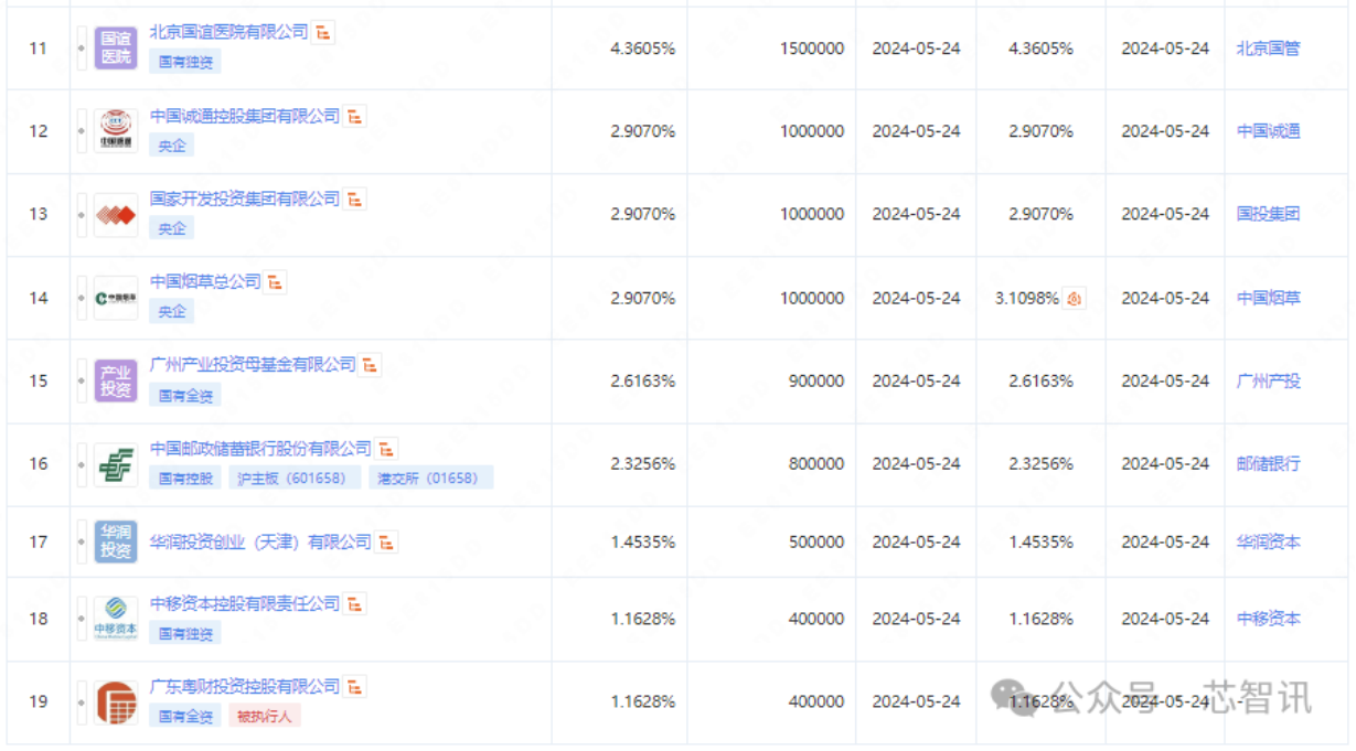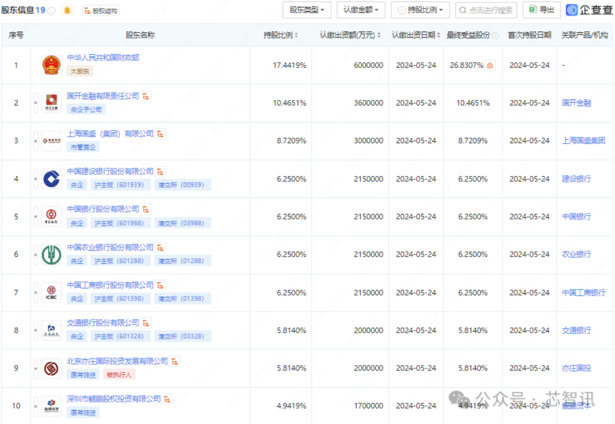 根據股(gu)東信息(xi)顯示(shi),大基金三期由財政部(17.4419%)、國開金融有限責任公司(10.4651%)、上海國盛(集團)有限公司(8.7209%)、中國建設銀行股份有限公司(6.25%)、中國銀行股份有限公司(6.25%)、中國工商銀行股份有限公司(6.25%)、中國農業銀行股份有限公司(6.25%)、交通銀行股份有限公司(5.8140%)等19位股東共同持股。