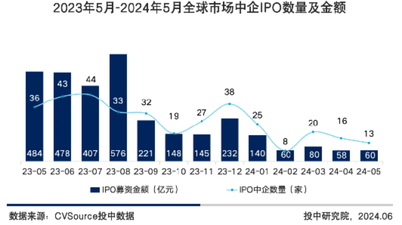 圖2 2023年5月(yue)-2024年5月(yue)全球市場中(zhong)企IPO數量及金額