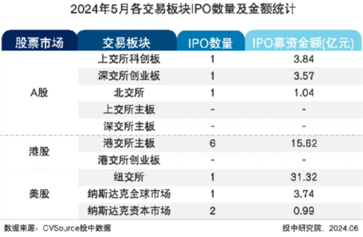 表1 2024年5月(yue)各(ge)交易板塊(kuai)IPO數量及金額統計