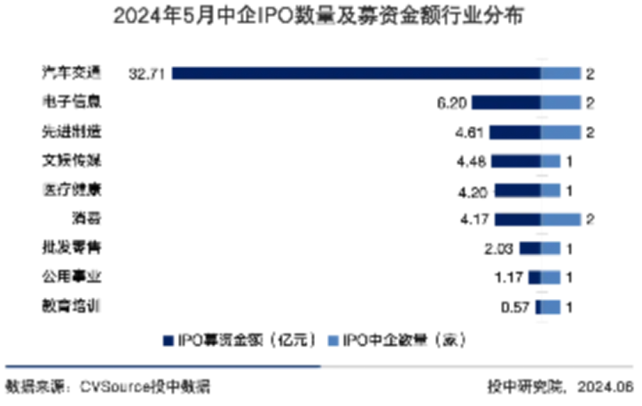 2024年(nian)5月,汽(qi)車交(jiao)通行業(ye)(ye)企(qi)業(ye)(ye)IPO募資金額最(zui)高,為32.71億(yi)元,占全行業(ye)(ye)募資金額的54.52%;其余行業(ye)(ye)IPO金額均不足10億(yi)元;汽(qi)車交(jiao)通、電(dian)子信息、先進制造、消費(fei)行業(ye)(ye)上市數量均為2家,其余行業(ye)(ye)均為1家。其中,智能(neng)電(dian)動(dong)汽(qi)車品牌商極氪智能(neng)(ZK.NYSE)以募資金額31.32億(yi)元居首位。