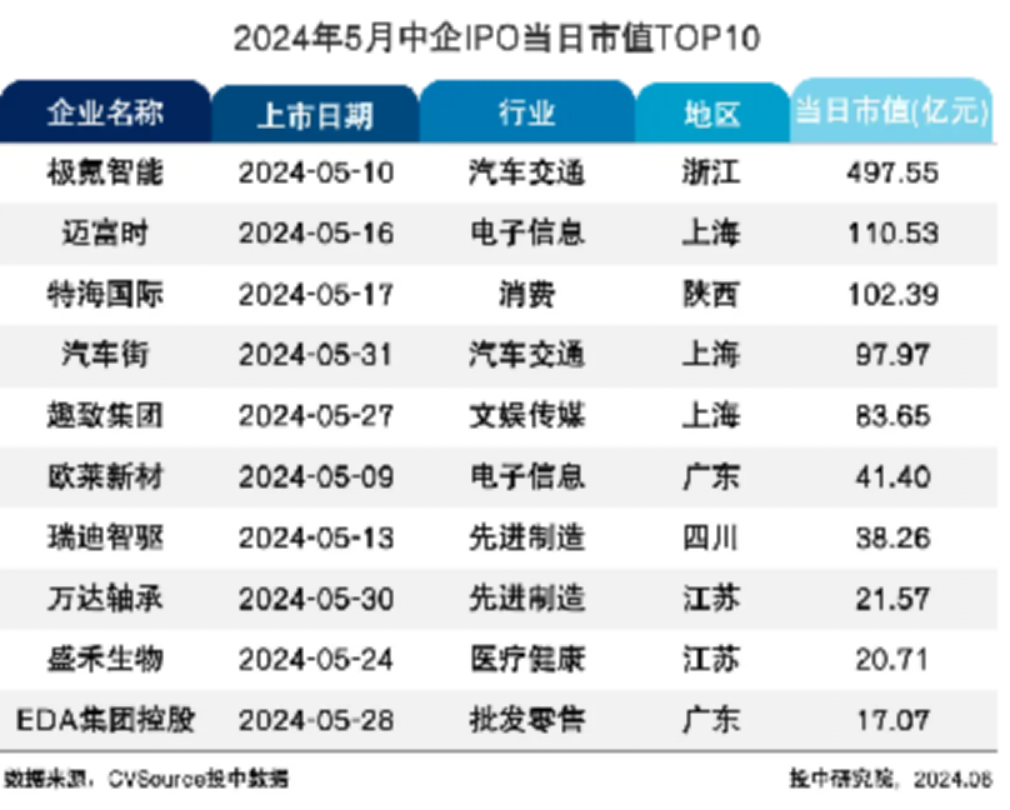 表9 2024年5月(yue)中企IPO當日市值TOP10