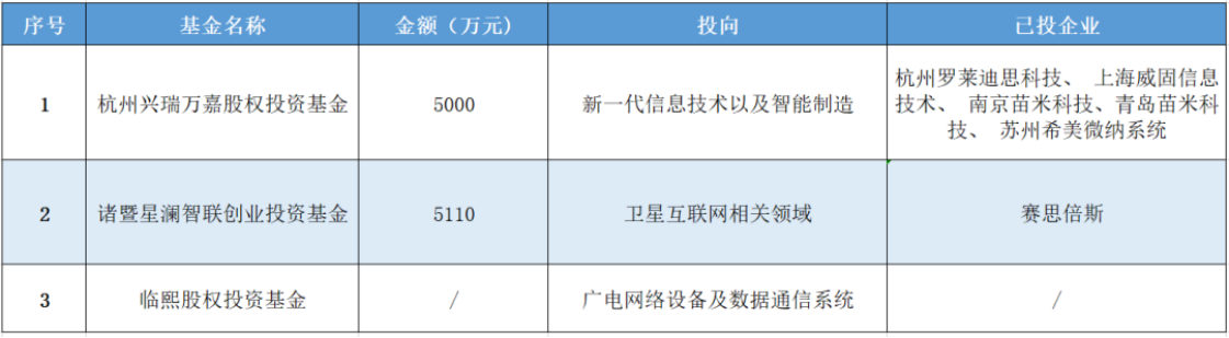 興瑞萬嘉于2019年設立,主要投向發掘、孵化、培育新一代信息技術以及智能制造等符合上市公司主營業務戰略發展方向的優質項目,共投資5個項目;星瀾智聯主要投向衛星互聯網相關領域,加快新一代信息技術領域的布局,目前僅有一個項目出資;臨熙股權基金則是投向廣電網絡設備及數據通信系統等相關集成電路及下游熱點應用領域內的企業,尚無公開投資動作。