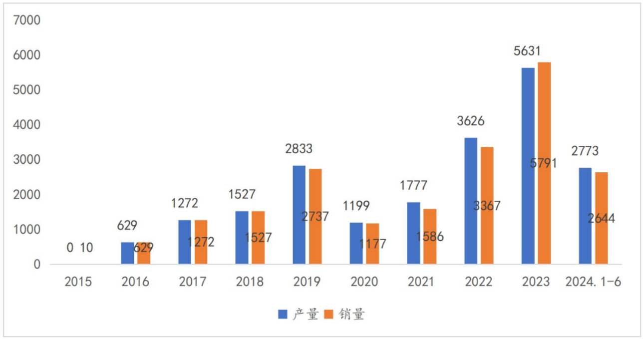 圖 1:2015-2024年(nian)上半年(nian)氫燃料(liao)電池汽車產量和(he)銷(xiao)量