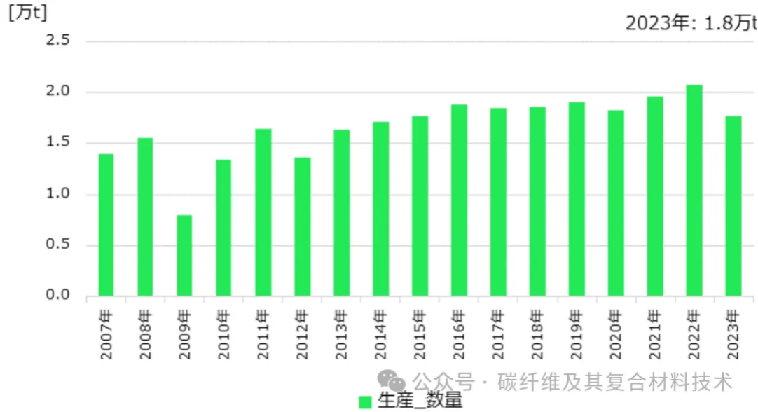 2023年(nian)日(ri)(ri)本本土(tu)碳(tan)纖維的總產(chan)量(liang)為1.8萬噸(dun),而2022年(nian)日(ri)(ri)本碳(tan)纖維產(chan)量(liang)接(jie)近(jin)(jin)2.1萬噸(dun),是(shi)自2007年(nian)以(yi)來的最高水平(ping);與2022年(nian)相比,2023年(nian)日(ri)(ri)本碳(tan)纖維產(chan)量(liang)下(xia)降較為明顯,降幅(fu)達到了14.2%,基本上接(jie)近(jin)(jin)近(jin)(jin)10年(nian)來的最低值(zhi)。