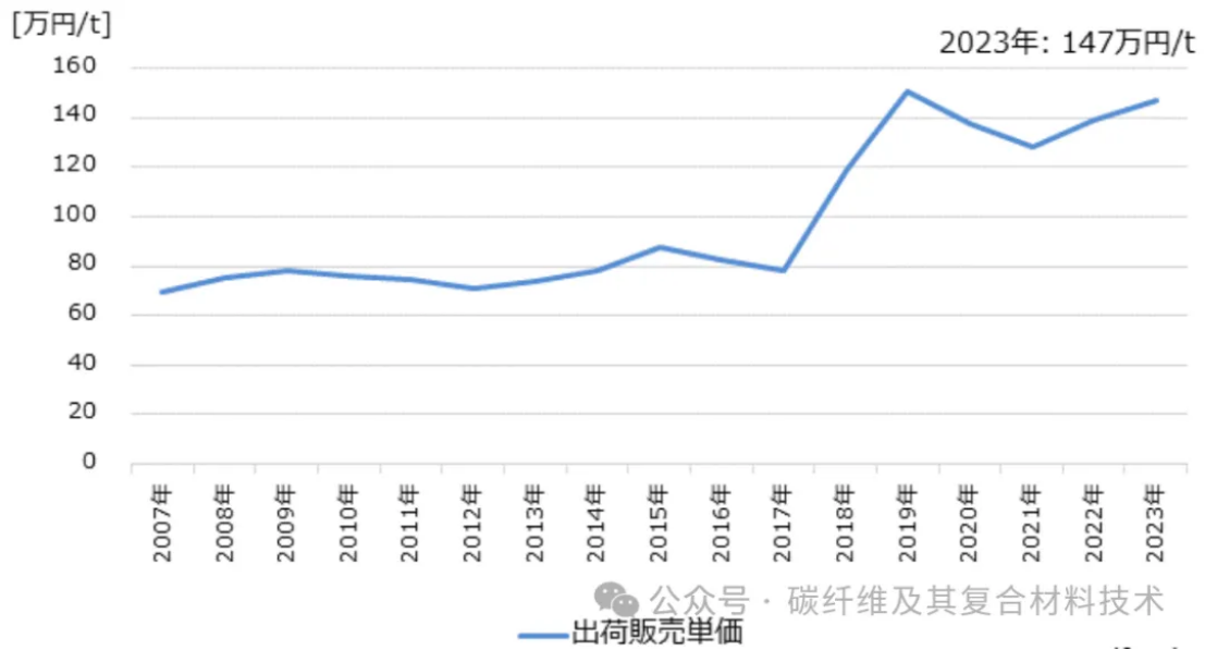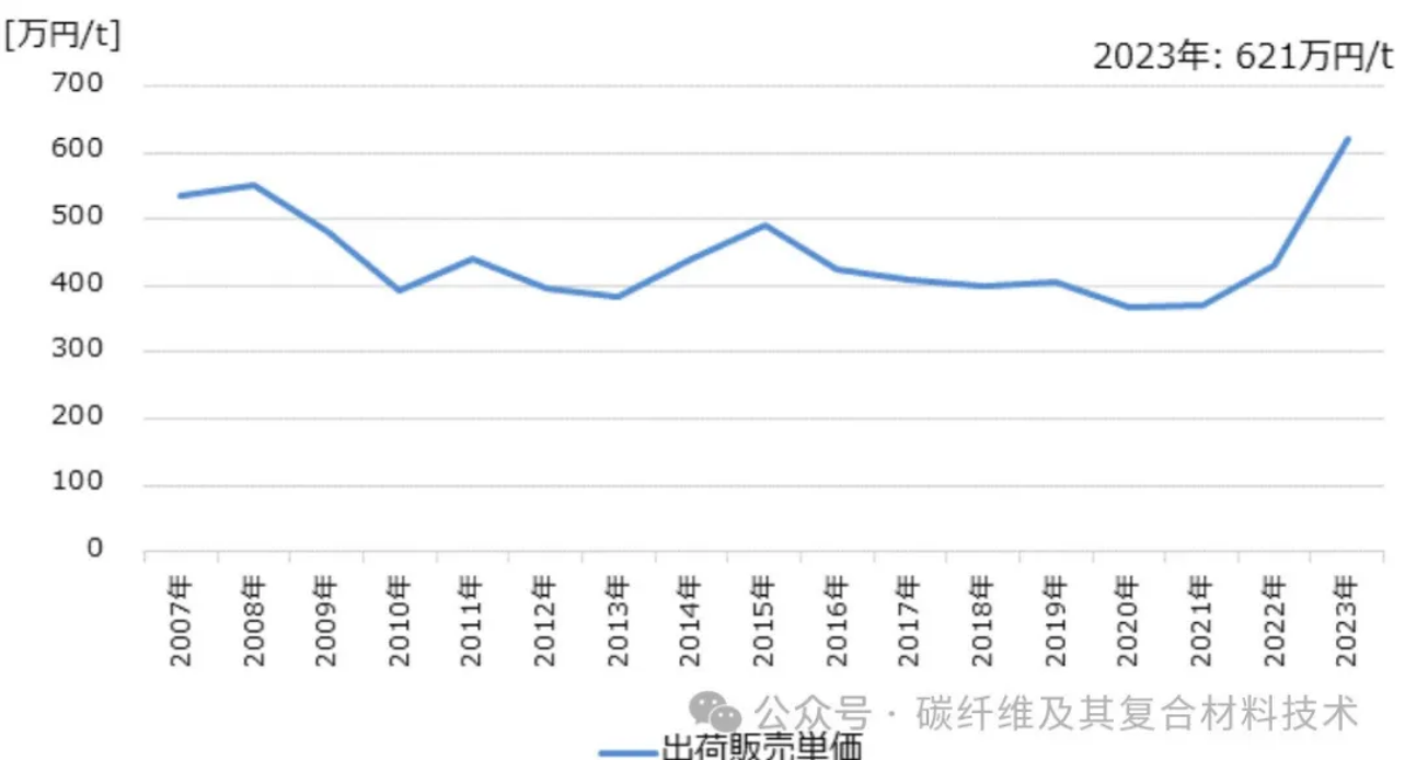 2023年,日本(ben)碳纖(xian)維(wei)的(de)出廠銷售價(jia)(jia)(jia)格(ge)為621萬日元(yuan)/噸(按2023年匯(hui)率約合30萬人民幣/噸,約300元(yuan)/kg),與(yu)2022年相比,碳纖(xian)維(wei)價(jia)(jia)(jia)格(ge)上漲了(le)44%,值(zhi)(zhi)得(de)關注的(de)是該價(jia)(jia)(jia)格(ge)也達到了(le)自2007年以來碳纖(xian)維(wei)價(jia)(jia)(jia)格(ge)的(de)最高值(zhi)(zhi)。