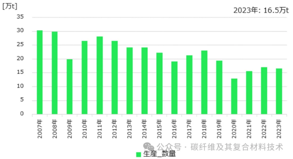 2023年(nian)(nian)日本碳纖維(wei)制品(pin)的(de)(de)總產量為16.5萬噸,比2022年(nian)(nian)同期(qi)相(xiang)(xiang)比下(xia)降了3.1%;這也(ye)是自2020年(nian)(nian)經歷連續三年(nian)(nian)上漲(zhang)后,碳纖維(wei)制品(pin)首次(ci)出(chu)現下(xia)降,但是從總體(ti)(ti)趨(qu)勢來(lai)(lai)看,2007年(nian)(nian)以來(lai)(lai),日本碳纖維(wei)制品(pin)呈現顯著下(xia)降趨(qu)勢,而(er)2023年(nian)(nian)碳纖維(wei)制品(pin)銷量僅僅相(xiang)(xiang)當于(yu)2007年(nian)(nian)銷量的(de)(de)54.6%。