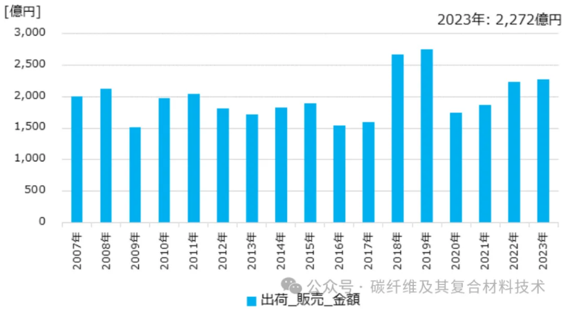 2023年(nian)日本碳纖維(wei)制品(pin)的(de)出(chu)貨銷售額(e)為(wei)2272億日元,比(bi)去年(nian)同期增長了1.8%;自2020年(nian)以來已(yi)經(jing)歷(li)了連續(xu)4年(nian)的(de)增長。日本碳纖維(wei)制品(pin)最(zui)高(gao)銷售額(e)出(chu)現在新(xin)冠疫(yi)情(qing)(qing)前的(de)2019年(nian),與(yu)之相(xiang)比(bi),2023年(nian)銷售額(e)相(xiang)當于(yu)2019年(nian)疫(yi)情(qing)(qing)前的(de)82.5%。