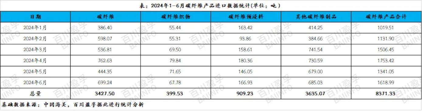 2024年6月我國進口碳纖(xian)維(wei)699.24噸(dun),進口碳纖(xian)維(wei)織物67.78噸(dun),進口碳纖維預浸料166.93噸,進(jin)口(kou)其他碳纖(xian)維制品685.03噸,進(jin)口(kou)碳纖(xian)維產品合計(ji)1618.99噸。