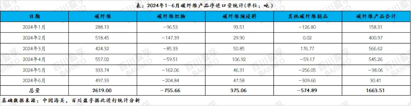 2024年(nian)6月我國出(chu)口(kou)(kou)碳(tan)纖維(wei)(wei)201.91噸,出(chu)口(kou)(kou)碳(tan)纖維(wei)(wei)織物272.63噸,出(chu)口(kou)(kou)碳(tan)纖維(wei)(wei)預(yu)浸(jin)料119.35噸,出(chu)口(kou)(kou)其他碳(tan)纖維(wei)(wei)制品994.69噸,出(chu)口(kou)(kou)碳(tan)纖維(wei)(wei)產品合計(ji)1588.58噸。
