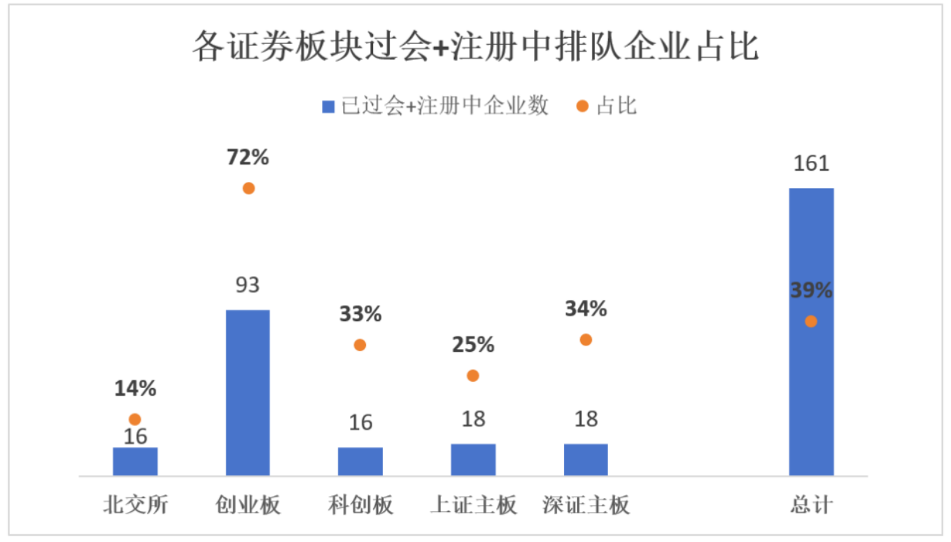 Wind數據顯示,當(dang)前滬深北三市IPO排(pai)隊企業(ye)(ye)共417家(jia),而已(yi)過會(hui)+注(zhu)冊中(zhong)(zhong)企業(ye)(ye)數量達(da)(da)(da)到161家(jia),占比達(da)(da)(da)到39%,分板(ban)塊看,除北證(zheng)、上(shang)證(zheng)主板(ban)外(wai),各板(ban)塊過會(hui)+注(zhu)冊中(zhong)(zhong)企業(ye)(ye)占排(pai)隊企業(ye)(ye)比均達(da)(da)(da)到30%以上(shang),其中(zhong)(zhong)創業(ye)(ye)板(ban)更高達(da)(da)(da)72%。