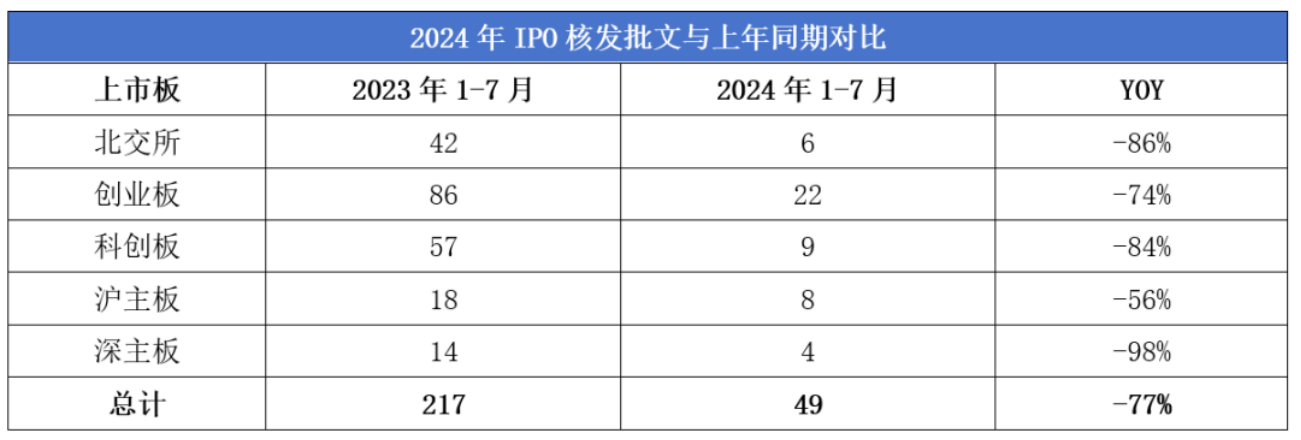 從整體(ti)來看(kan),Choice數(shu)據顯(xian)示,2024年(nian)1-7月(截(jie)至7月16日),滬(hu)深北(bei)(bei)三市(shi)核發IPO批(pi)文數(shu)量(liang)為49份,較去年(nian)同期(qi)的217份下(xia)降了77%,其中北(bei)(bei)證、科創板、滬(hu)主(zhu)板、深主(zhu)板四大板塊今年(nian)獲批(pi)數(shu)量(liang)均為個位(wei)數(shu),同比降幅均超過80%。