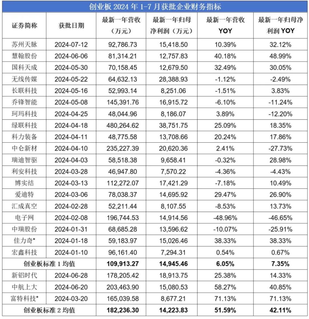 2、財務指標(biao)方面:2024年(nian)(nian)1-7月,創(chuang)(chuang)業(ye)(ye)(ye)板(ban)獲(huo)批(pi)企(qi)(qi)業(ye)(ye)(ye)包括(kuo)19家創(chuang)(chuang)業(ye)(ye)(ye)板(ban)標(biao)準1企(qi)(qi)業(ye)(ye)(ye)、3家創(chuang)(chuang)業(ye)(ye)(ye)板(ban)標(biao)準2企(qi)(qi)業(ye)(ye)(ye),其中標(biao)準1企(qi)(qi)業(ye)(ye)(ye)最(zui)新(xin)一(yi)年(nian)(nian)營(ying)收(shou)、歸(gui)母凈利潤(run)均(jun)值(zhi)109,913.27萬元、14,945.46萬元。標(biao)準2企(qi)(qi)業(ye)(ye)(ye)最(zui)新(xin)一(yi)年(nian)(nian)營(ying)收(shou)、歸(gui)母凈利潤(run)均(jun)值(zhi)182,236.30萬元、14,223.83萬元。