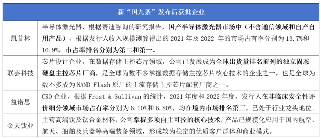 今年(nian)1-7月科創板(ban)獲(huo)批企(qi)業8家,其中2家已上(shang)市(shi),新“國九條”發(fa)布后獲(huo)批企(qi)業4家,分(fen)別為凱普林、聯蕓科技、益諾思、金天鈦(tai)業。從其(qi)披(pi)露信息來看,新“國(guo)九條”發布后獲批(pi)企業突出(chu)特征(zheng)包括:行業聚(ju)焦集(ji)成電路、醫藥、高端新材料(liao)領域、行業地(di)位突出、商業化較為成熟。