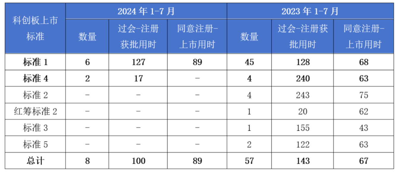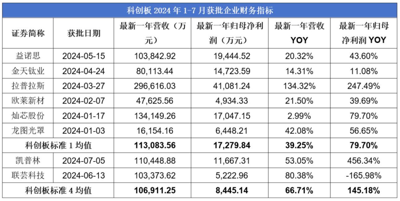 2、財(cai)務指標方面:2024年1-7月,科(ke)(ke)創板(ban)獲批企業(ye)(ye)(ye)包(bao)括6家科(ke)(ke)創板(ban)標準1企業(ye)(ye)(ye)、2家科(ke)(ke)創板(ban)標準4企業(ye)(ye)(ye),其中(zhong)標準1企業(ye)(ye)(ye)最新一(yi)年營(ying)(ying)收、歸(gui)母(mu)凈利潤(run)(run)均(jun)值113,083.56萬(wan)元(yuan)(yuan)(yuan)、17,279.84萬(wan)元(yuan)(yuan)(yuan)。標準4企業(ye)(ye)(ye)最新一(yi)年營(ying)(ying)收、歸(gui)母(mu)凈利潤(run)(run)均(jun)值106,911.25萬(wan)元(yuan)(yuan)(yuan)、8,445.14萬(wan)元(yuan)(yuan)(yuan)。最低獲批營(ying)(ying)收、歸(gui)母(mu)凈利潤(run)(run)分別為(wei)16,154.16萬(wan)元(yuan)(yuan)(yuan)、4,934.33萬(wan)元(yuan)(yuan)(yuan)。