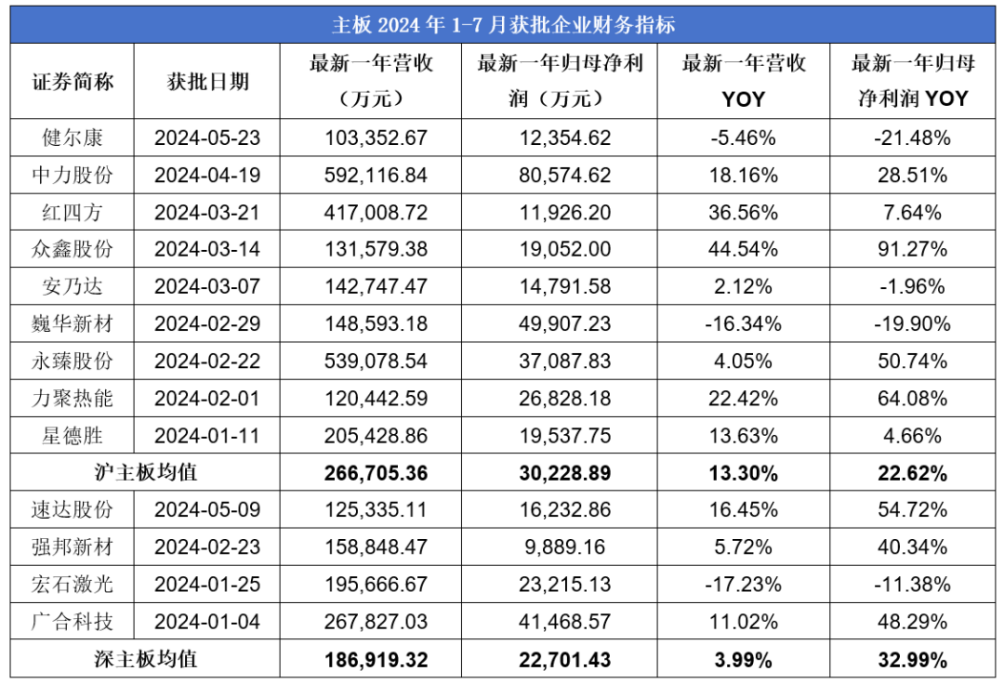 2、財(cai)務指(zhi)標方面:2024年1-7月,主板獲批企業(ye)包括9家滬主板企業(ye)、4家深(shen)主板企業(ye),其(qi)中滬主板企業(ye)最(zui)新(xin)一年營(ying)收、歸(gui)母凈利潤(run)均值(zhi)266,705.36萬(wan)(wan)元(yuan)、30,228.89萬(wan)(wan)元(yuan)。深(shen)主板企業(ye)最(zui)新(xin)一年營(ying)收、歸(gui)母凈利潤(run)均值(zhi)186,919.32萬(wan)(wan)元(yuan)、22,701.43萬(wan)(wan)元(yuan)。