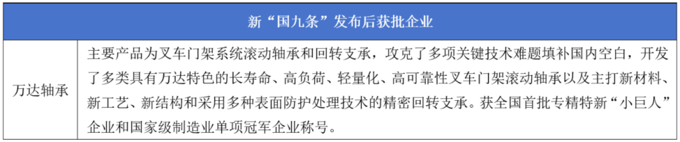 今年(nian)1-7月北交所獲批(pi)企業(ye)6家,且均已上(shang)市,新(xin)“國九條”發布后(hou)獲批(pi)企業(ye)1家,為(wei)萬達(da)軸承(cheng)。從其披(pi)露(lu)信息來看,新(xin)“國九條”發布后(hou)獲批(pi)企業(ye)突出特征包(bao)括:國產替代、制造業單項(xiang)冠軍(jun)企業。