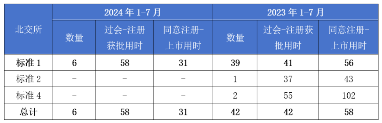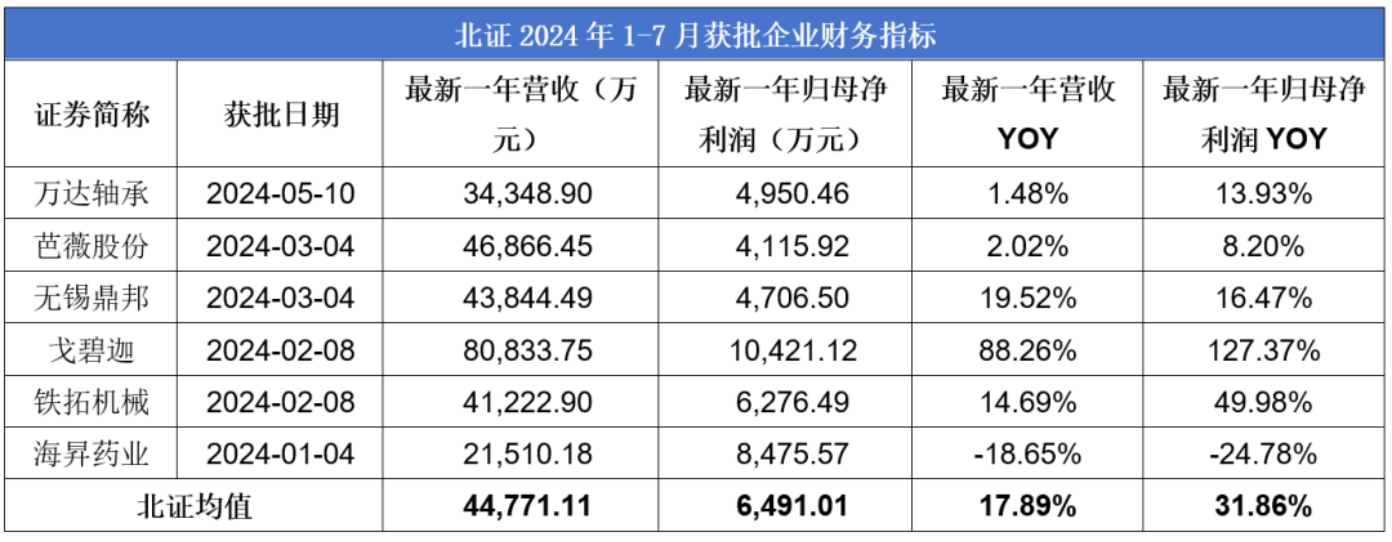 2、財(cai)務指標方面:2024年1-7月,北(bei)證獲批企(qi)業(ye)均(jun)為北(bei)證標準1上市企(qi)業(ye),其(qi)最新一年營收、歸(gui)母凈利(li)潤均(jun)值44,771.11萬(wan)(wan)元(yuan)、6,491.01萬(wan)(wan)元(yuan)。 最低獲批營收、歸(gui)母凈利(li)潤分別為21,510.18萬(wan)(wan)元(yuan)、4,115.92萬(wan)(wan)元(yuan)。其(qi)中:新“國九條”發布(bu)后獲批企(qi)業(ye):——獲批企(qi)業(ye)共1家,營收、歸(gui)母凈利(li)潤分別為34,348.90萬(wan)(wan)元(yuan)、4,950.46萬(wan)(wan)元(yuan)。