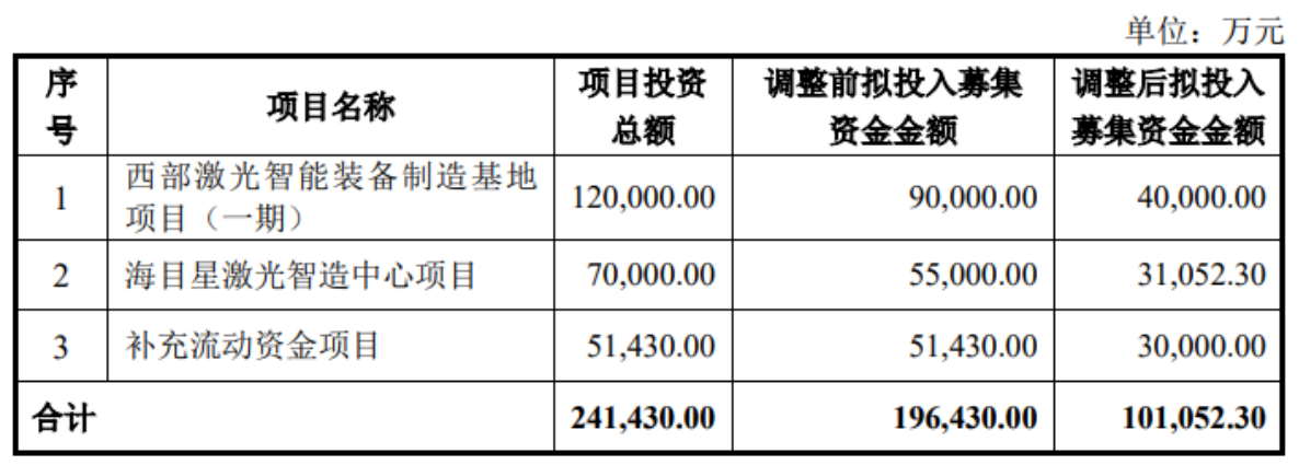 據海目星激光今年8月31日披露(lu)的《海目(mu)星(xing)激光科技(ji)集(ji)團(tuan)股份有限公司關于調(diao)整募集(ji)資(zi)金(jin)投(tou)資(zi)項目(mu)擬投(tou)入募集(ji)資(zi)金(jin)金(jin)額的公告》顯(xian)示,其此前向特定對象發行(xing)股票募集(ji)資(zi)金(jin)凈(jing)額將用于以下募投(tou)項目(mu):