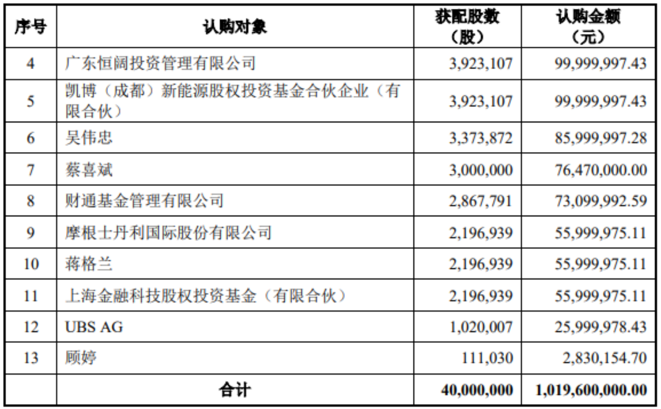 2021年11月24日,欣旺達以41.90元/股實(shi)施(shi)定增,合計募資39.15億元,主(zhu)要用于“3C消費(fei)類鋰(li)離子電芯擴產項目(mu)”、“3C消費(fei)類鋰(li)電池模組(zu)擴產項目(mu)”、“筆記本電腦類鋰(li)電池模組(zu)擴產項目(mu)”三大部(bu)分(fen),并借此補(bu)充(chong)流動資金。而(er)包括瑞銀、巴(ba)克萊(lai)、易方(fang)達、景林、申萬宏源(yuan)等著名內外資皆參與此次交(jiao)易。