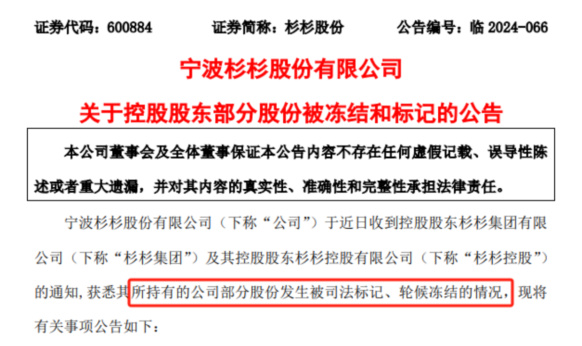 杉(shan)(shan)杉(shan)(shan)股(gu)份只是說日收到控(kong)股(gu)股(gu)東(dong)杉(shan)(shan)杉(shan)(shan)集團及杉(shan)(shan)杉(shan)(shan)控(kong)股(gu)的通知,獲悉其(qi)所(suo)持有的公司部分(fen)股份發生被司法標記、輪(lun)候凍結的情況。