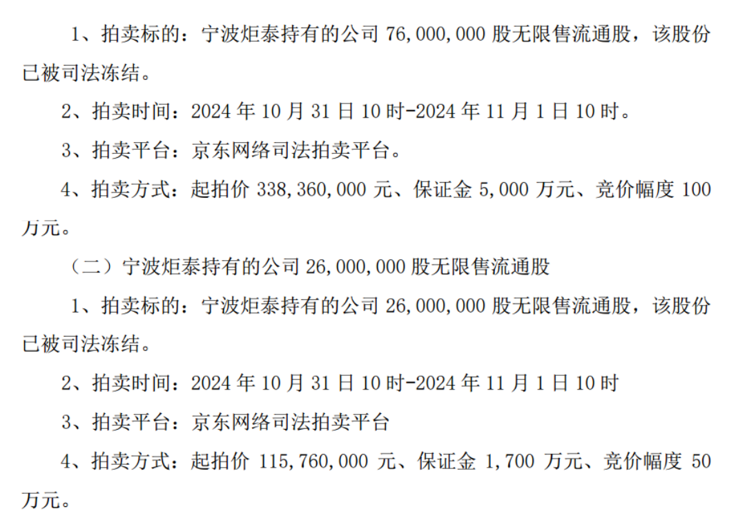 而另(ling)一家(jia)杉(shan)杉(shan)系的上市公(gong)司(si)永杉(shan)鋰業,則公(gong)告(gao)已接到遼(liao)寧(ning)省凌(ling)海(hai)市人民法院(yuan)通知(zhi),公(gong)司(si)控(kong)股(gu)(gu)股(gu)(gu)東(dong)寧(ning)波炬泰投資管理有(you)限公(gong)司(si)(以下(xia)簡稱寧(ning)波炬泰)所持公(gong)司(si)無限售流通股(gu)(gu)7600萬股和(he)2600萬股擬進行司(si)法拍賣,時(shi)間均擬定為10月31日10時(shi)至11月1日10時(shi)。