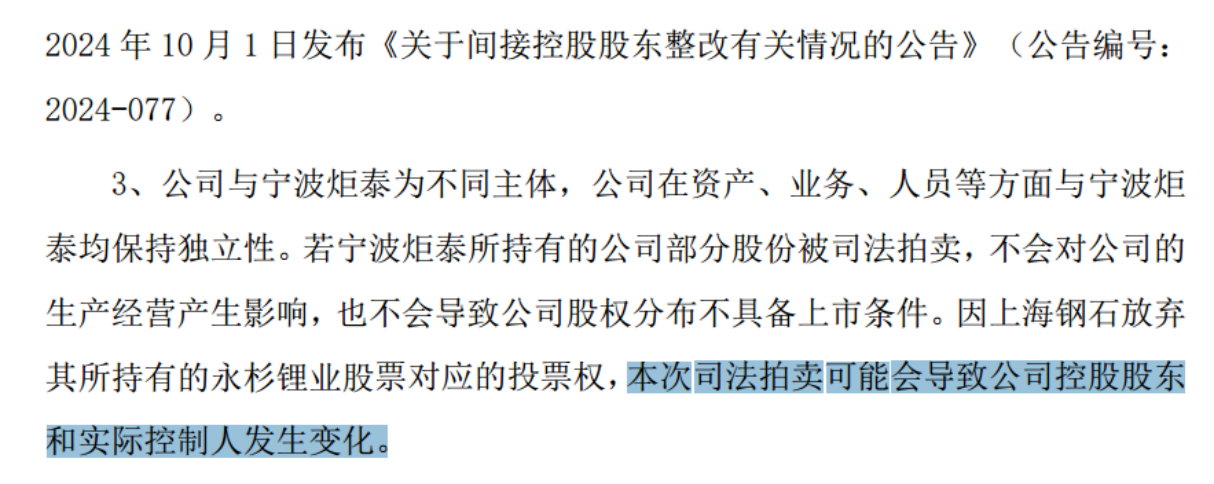 如果(guo)完成上述司法拍賣的(de)股份交割(ge),寧(ning)波炬泰及其一致行(xing)動(dong)人上海鋼石合計持有永(yong)杉鋰業的(de)股份比(bi)例為24.32%。