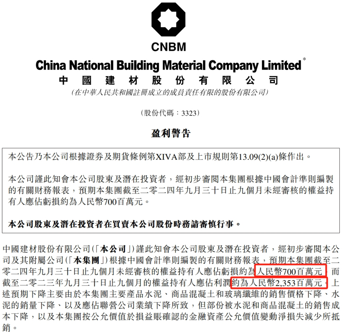 中國(guo)建材10月15日在港交所公告,預期集團前三季度未經審核的權益持有人應占虧損約為7億元,而上年同期的權益持有人應占利潤約為23.53億元。