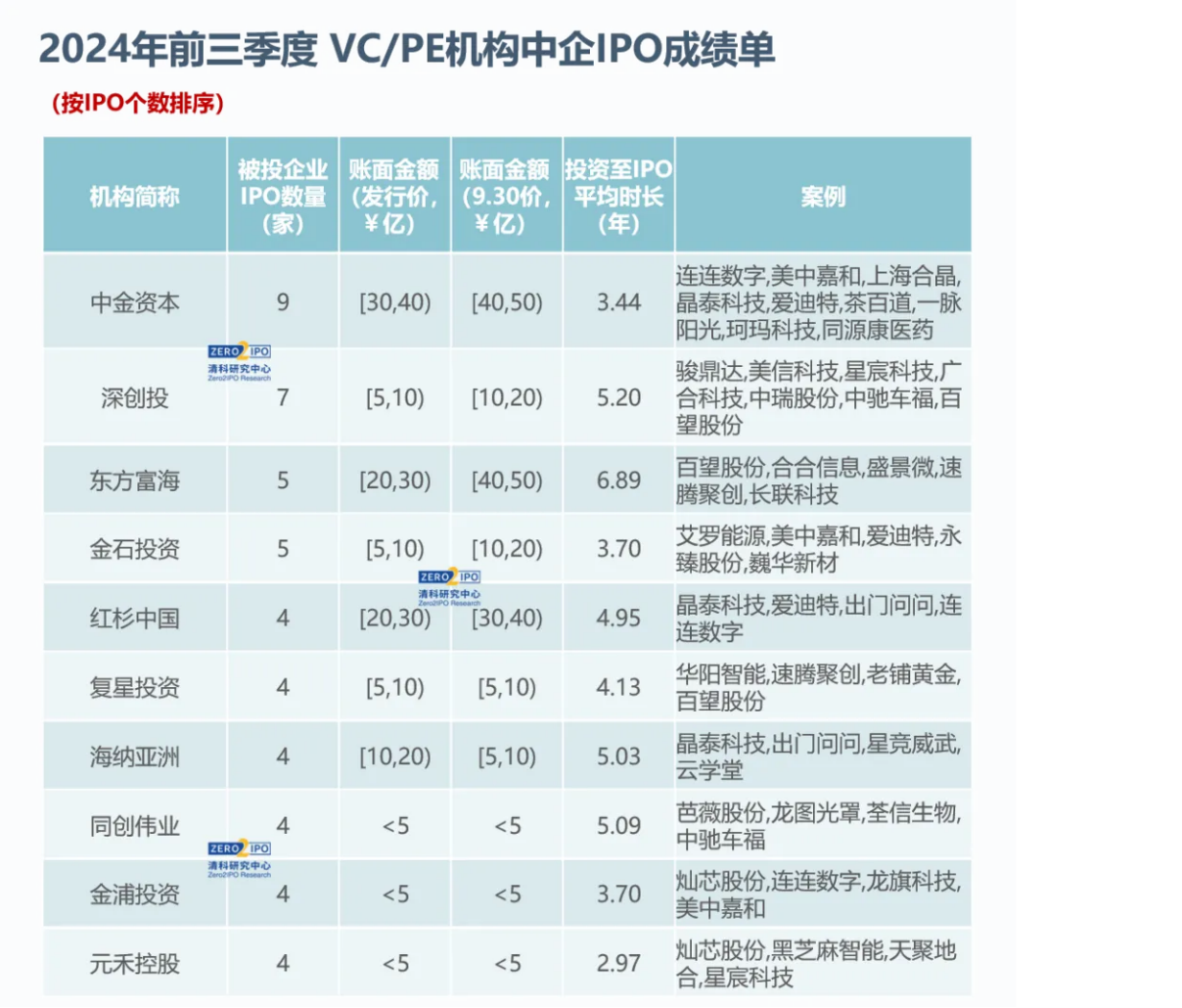 根據清科創(chuang)業(01945.HK)旗下清科研究中心統計,2024年前三季度VC/PE支持的IPO共87家企業,背后涉及438家機構,有IPO的機構數同比下滑47.5%。其中,2024年前三季度收獲4個及以上IPO的機構共10家,僅為去年同期約兩成,VC/PE通過IPO退出的難度升級。