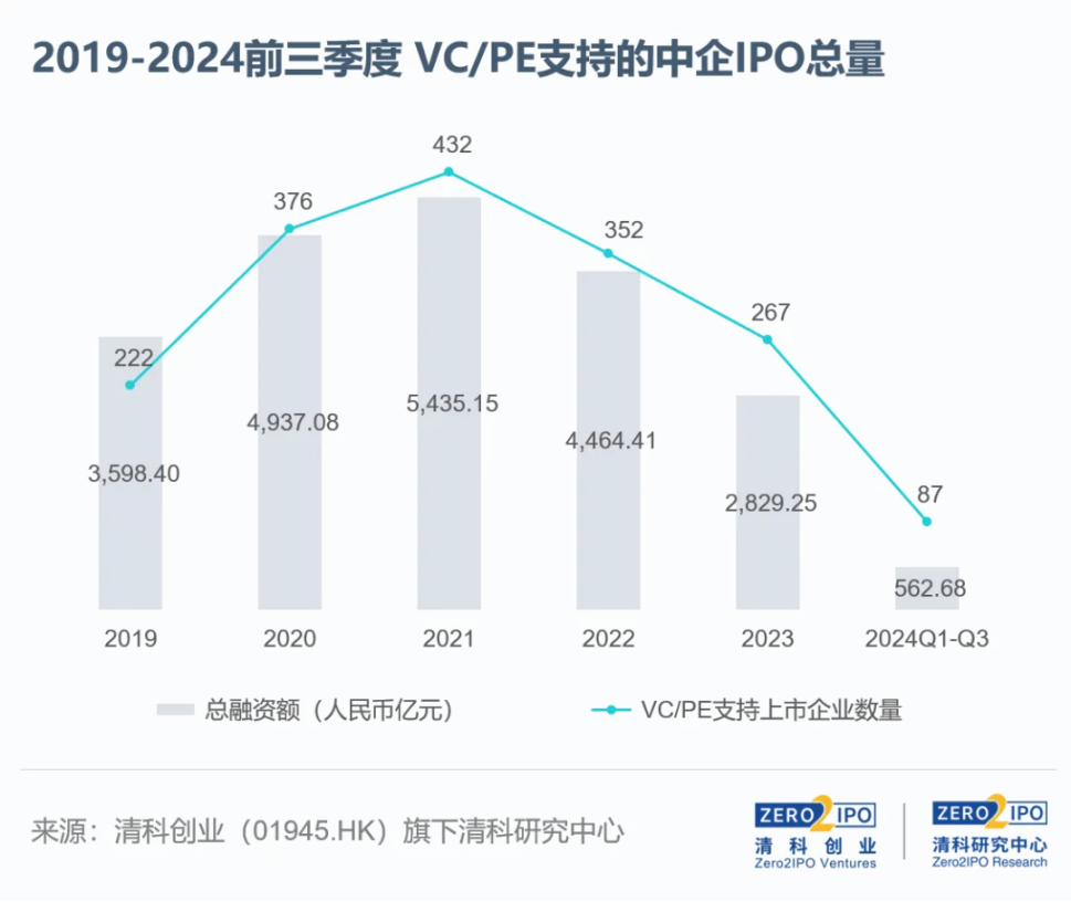 VC/PE支持(chi)的中企(qi)IPO總(zong)量處于(yu)近年低(di)位(wei),僅為去年同期四(si)成。2024年前(qian)三(san)季度,87家(jia)上市(shi)中企獲(huo)得VC/PE支持,同比下降60.1%,第(di)(di)一季度、第(di)(di)二季度和第(di)(di)三(san)季度分別(bie)為(wei)29家(jia)、26家(jia)和32家(jia)。