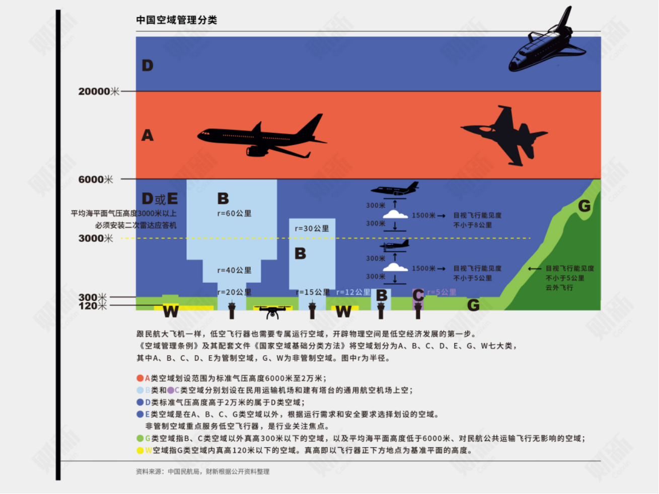 直到2023年12月21日,民航局正式發布《國家空域基礎分類方法》,將空域劃分為管制空域和非管制空域兩大類,其中劃設A、B、C、D、E、G、W七類空域,A、B、C、D、E為管制空域,G、W為非管制空域。