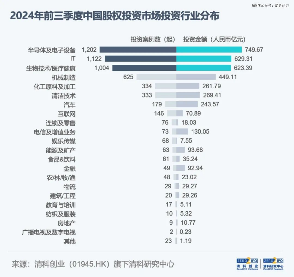 2024年前三(san)季(ji)度(du),我國股權(quan)投(tou)(tou)(tou)資(zi)(zi)市場投(tou)(tou)(tou)資(zi)(zi)熱度(du)排名(ming)前三(san)的行業(ye)依次(ci)為半導體(ti)(ti)及電子設(she)備、IT、生物技術/醫療(liao)(liao)健康(kang)。其中(zhong),半導體(ti)(ti)及電子設(she)備行業(ye)以1,202起(qi)案(an)例數(shu)(同比-33.8%)和749.67億元(yuan)投(tou)(tou)(tou)資(zi)(zi)金(jin)(jin)額(-46.2%)居于榜首。IT行業(ye)共發生投(tou)(tou)(tou)資(zi)(zi)案(an)例數(shu)1,122起(qi)(-23.4%),吸納投(tou)(tou)(tou)資(zi)(zi)金(jin)(jin)額629.31億元(yuan),同比增加11.4%,主要由人工(gong)智(zhi)能賽道推高(gao),AI大模型企業(ye)月之暗(an)面、Minimax、智(zhi)譜AI、百(bai)川智(zhi)能等均獲得數(shu)十億資(zi)(zi)金(jin)(jin)注(zhu)入。生物技術/醫療(liao)(liao)健康(kang)行業(ye)以1,004起(qi)案(an)例數(shu)(-29.1%)和623.39億元(yuan)投(tou)(tou)(tou)資(zi)(zi)金(jin)(jin)額(-29.6%)次(ci)之,醫藥(yao)、醫療(liao)(liao)設(she)備領域仍是關注(zhu)重(zhong)點。