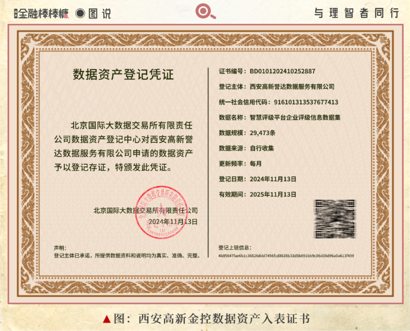 11月13日,西安高(gao)新金控旗下(xia)西安高(gao)新金融數(shu)(shu)(shu)(shu)據管理(li)有限(xian)公司(下(xia)稱金融數(shu)(shu)(shu)(shu)據公司)數(shu)(shu)(shu)(shu)據資產(chan)在北(bei)數(shu)(shu)(shu)(shu)所(suo)成(cheng)功登記掛牌(pai),此一時點,距7月初啟動上市不足(zu)5個月。除了北(bei)數(shu)(shu)(shu)(shu)所(suo)之外(wai),該(gai)數(shu)(shu)(shu)(shu)據資產(chan)還(huan)在陜西絲路數(shu)(shu)(shu)(shu)交中心同步登記掛牌(pai),成(cheng)為全國首個同時在兩家(jia)“數(shu)(shu)(shu)(shu)交所(suo)”登記掛牌(pai)的數(shu)(shu)(shu)(shu)據資產(chan)。